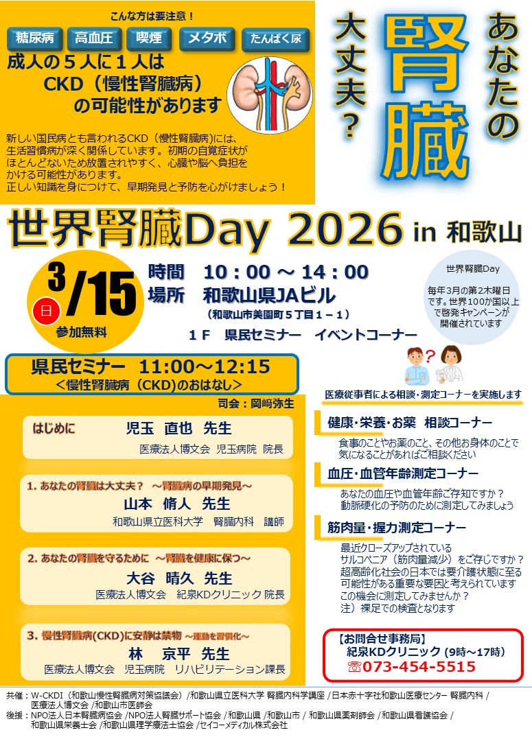 2026年3月15日 世界腎臓Day 2026 in 和歌山を開催いたします。
